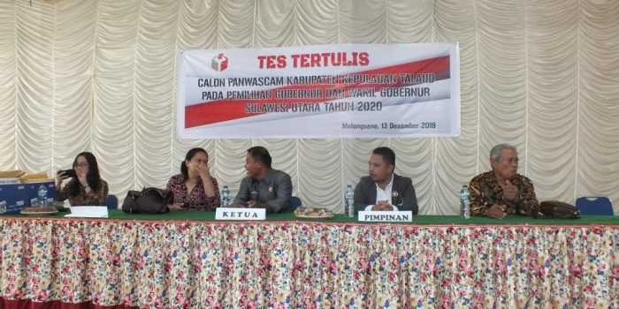Bawaslu\nKabupaten Kepulauan Talaud melaksanakan Tes Ujian Tertulis dan Tes Wawancara\nbagi calon Panwascam di Kabupaten Kepulauan Talaud, dalam rangka Pemilihan\nGubernur dan Wakil Gubernur tahun 2020 mendatang, yang bertempat di Penginapan\nSakina Melonguane, Jumat (13/12/2019)