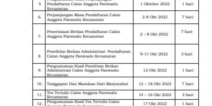 jadwal pelaksanaan tahapan perekrutan\n\n\n\nIa menuturkan, masa perpanjangan tersebut dilakukan dalam rangka pemenuhan berkas pendaftar perempuan calon anggota panwascam untuk beberapa kecamatan yang belum memenuhi kuota 30 persen, namun Bawaslu Kepulauan Talaud tetap akan menerima pendaftar laki-laki.